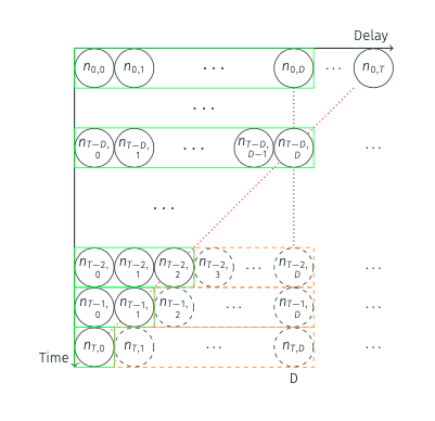 We can then simulate the data by day, onset day, and reporting day by applying the reporting delay distribution to the onsets (notice how this is nearly identical to the convolution pattern we’ve seen before except that we are not applying the sum):
