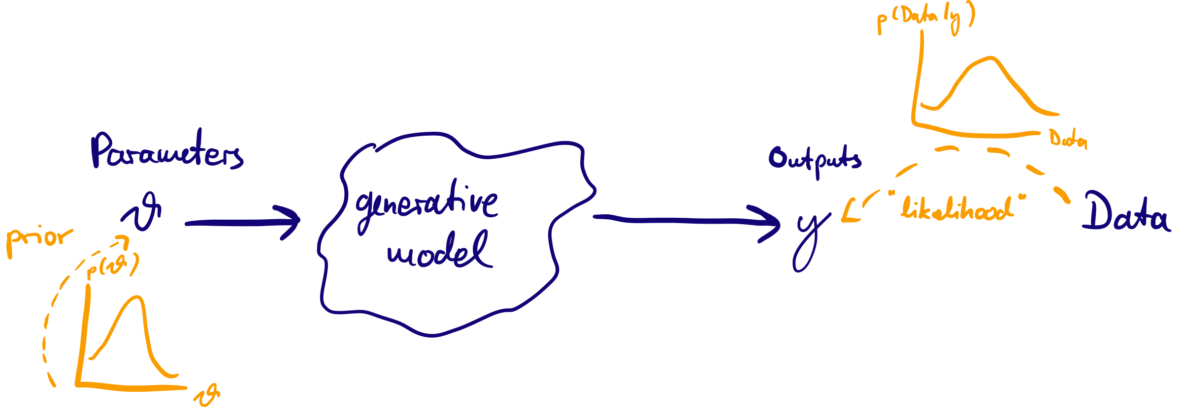 The generative model can produce output which looks like data given a set of parameters \(\theta\).